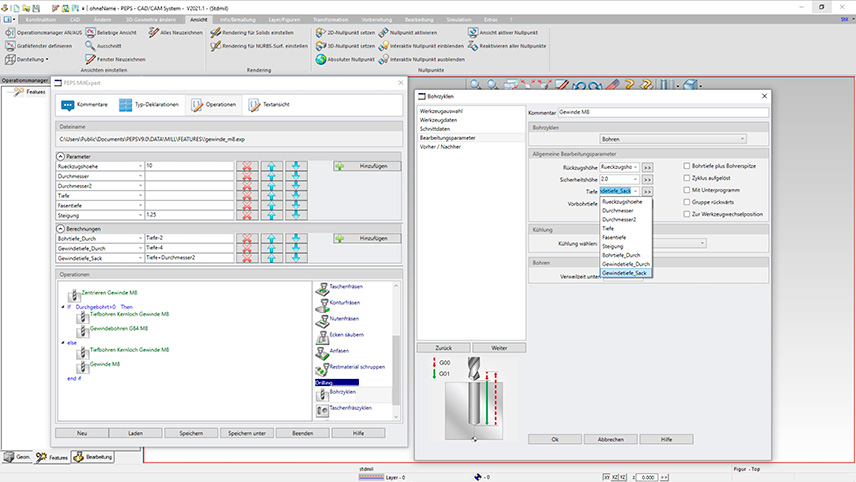 Der neue Feature-Editor ermöglicht es, Bearbeitungs-Features (z.B. Zentrieren, Bohren, Gewindebohren) auf einfachste Weise via Drag & Drop zu programmieren.